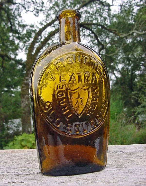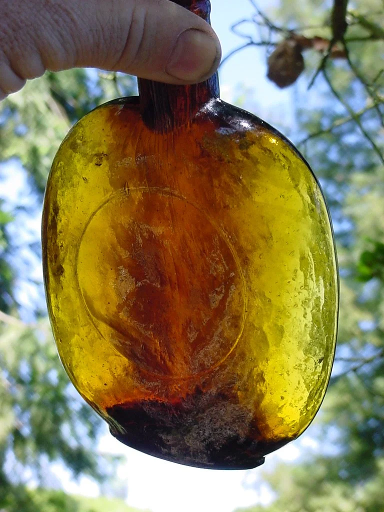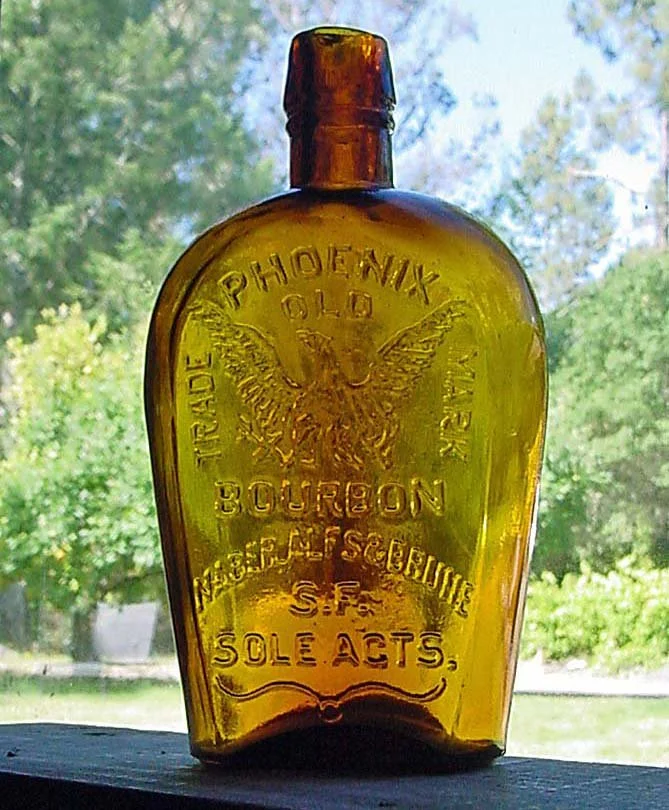 One of the most beautiful of all the early Western whiskey flask. Phoenix Old Bourbon. Found while digging a utility trench inside a building in the 1980s.